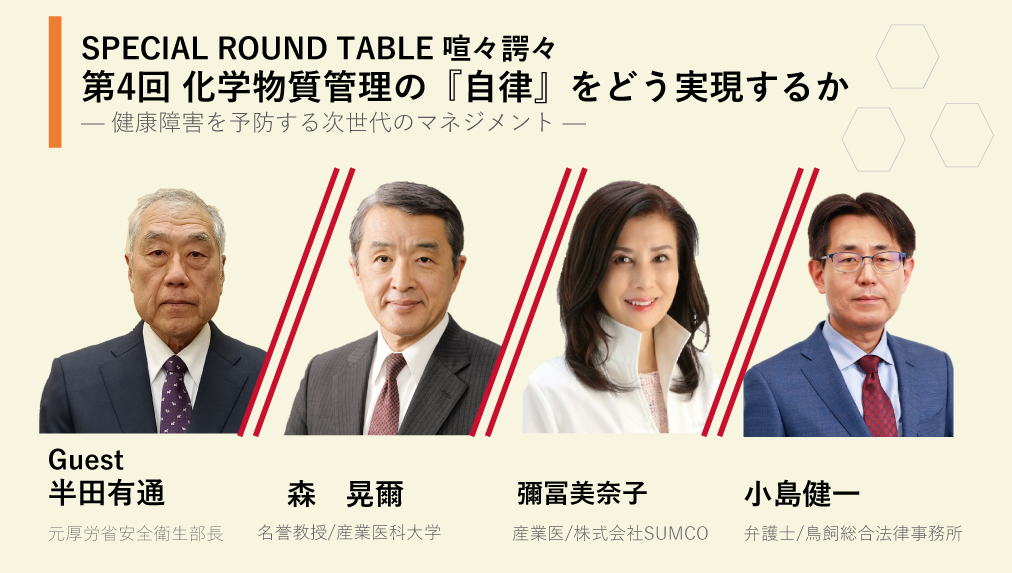 今回のテーマは「化学物質管理の自律をどう実現するか」。制度・実務・科学の最前線を知る元厚生労働省安全衛生部長半田先生を迎え、これまでの“ルール遵守型”から“自律管理型”への転換について、率直かつ踏み込んだ議論を行いました。 第1回では、「化学物質の自律的管理とは何か」を起点に、性能要件化の本質とともに、発がん性など長期影響をどうコントロールするのかという核心的な課題に迫ります。自律管理は本当に機能するのか―その可能性と限界を探る議論の全貌を、ぜひご覧ください。 |